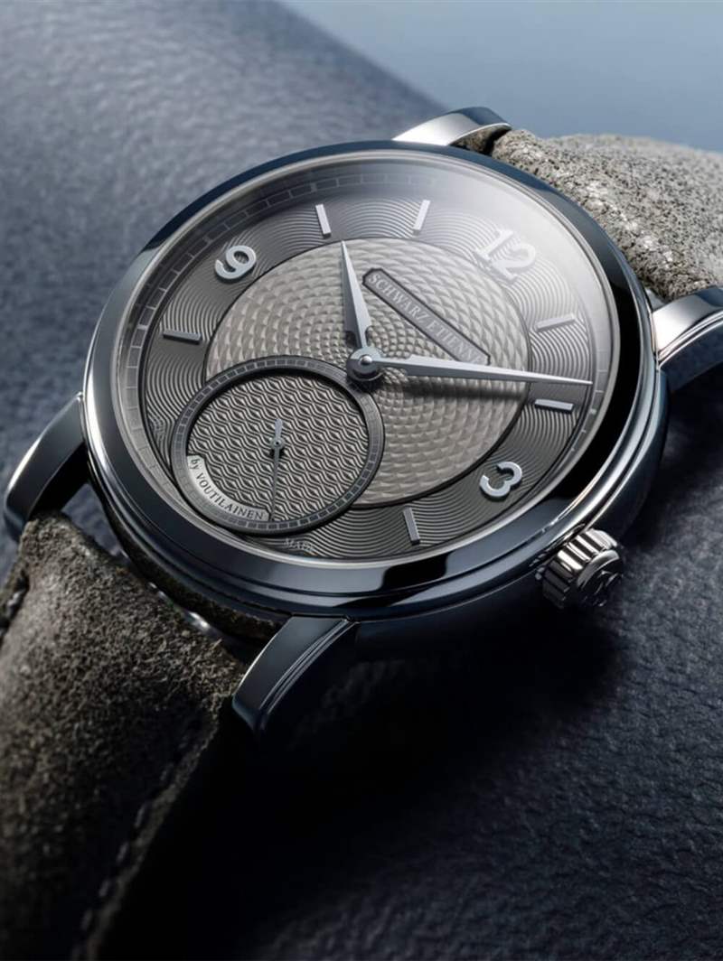就像 Voutilainen 的許多作品一樣,ROMA SYNERGY 的起點是表盤。有沙灰色或令人驚嘆的海藍色可供選擇,每種都有許多不同的、令人印象深刻的扭索飾技術。