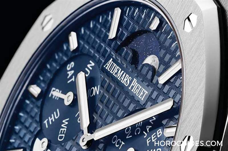 表盤布局方面,RD#2向1955年愛彼的第一款萬年歷腕表致敬,因此在12點鐘位置放上月相,其它配置包括3點鐘月份盤并外加一個閏年小盤、6點鐘是日期、9點鐘是星期盤外加日夜小盤。搭配「Grande Tapisserie」大型格紋裝飾藍色表盤、夜光涂層白金立體時標,更搭配鉑金表殼,更顯尊貴。