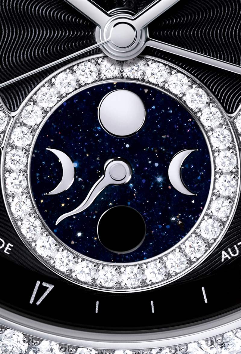 香奈兒制作了一段非常可愛的視頻,以配合 J12 月相系列的發(fā)布。不幸的是,它與月相關(guān)系不大。香奈兒首先是一家時(shí)裝公司,他們深知月相復(fù)雜功能更多的是情感而非實(shí)際。我通常不喜歡“指針式”與“圓盤式”月相指示器,但 Chanel 在這里做了很多工作,使他們的月相指示盤非常漂亮且易于閱讀。他們借鑒了許多經(jīng)典時(shí)計(jì),在砂金石表盤上使用蛇形指針。砂金石是一種閃閃發(fā)光的藍(lán)色寶石,可以很好地模仿夜空。我很高興看到它被用在這里,覺得它是香奈兒明智而高級(jí)的審美選擇。