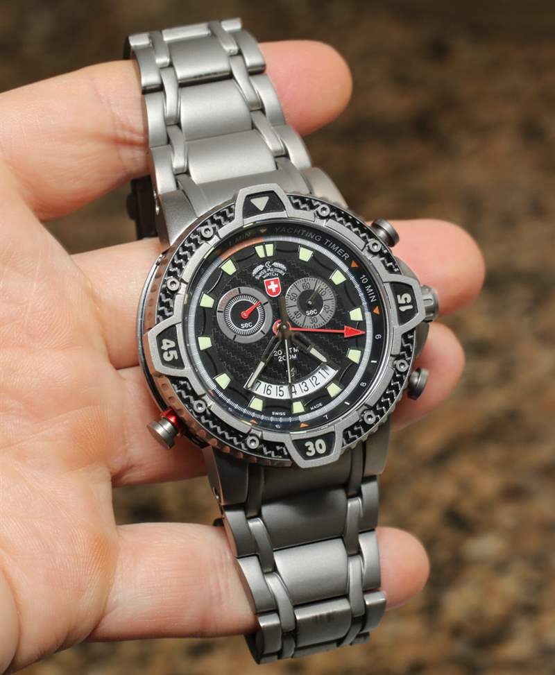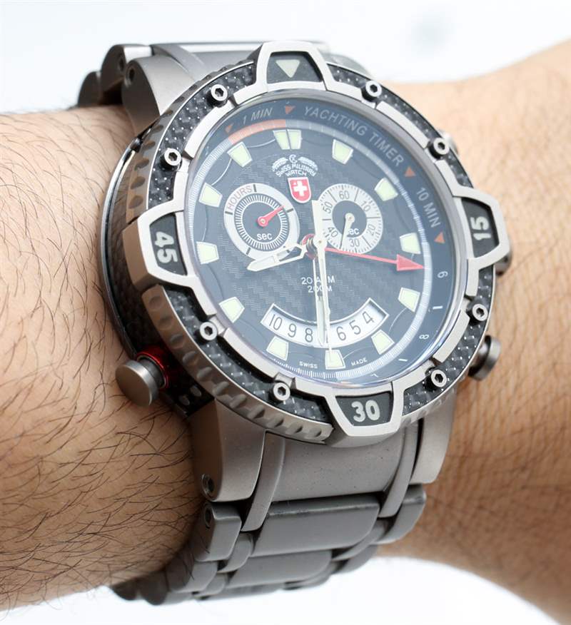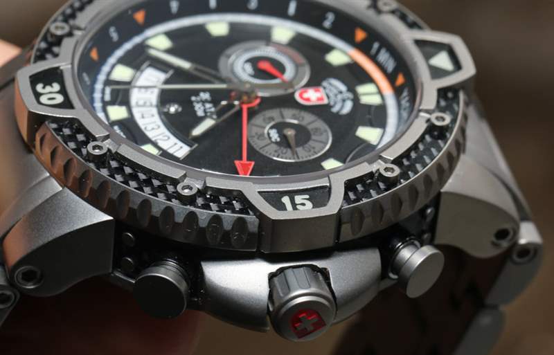 與機(jī)械式 20,000 英尺潛水員不同,臺風(fēng)是一款石英表。我們的想法是將帆船賽計時器、計時碼表和鬧鐘整合到一塊手表中,采用耐用且炫酷的設(shè)計。臺風(fēng)最好的部分很容易就是表殼和表鏈。Swiss Military Watch 在表殼設(shè)計和構(gòu)造上真的全力以赴。45 毫米寬的外殼在細(xì)節(jié)方面是我以前從未見過的。表殼由鈦和碳纖維元素制成。表盤周圍有一個大的旋轉(zhuǎn)表圈和三個按鈕以及一個旋入式表冠。表殼上的所有細(xì)節(jié)都很有趣,從許多鈦螺絲到表殼側(cè)面包裹的碳纖維。