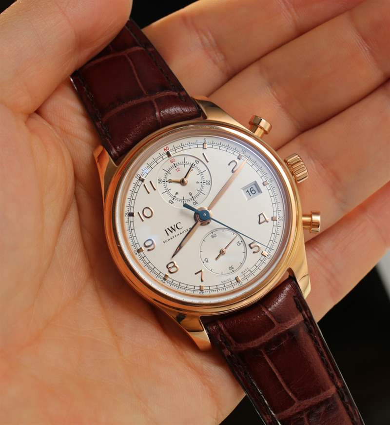 關(guān)于 IWC 葡萄牙經(jīng)典計(jì)時(shí)碼表,您需要了解的兩個(gè)最重要的細(xì)節(jié)是它有一個(gè) 42 毫米寬的表殼(有精鋼款或這里所見的 18k 玫瑰金款),以及它包含 IWC 萬國表自制機(jī)芯 89361自動(dòng)計(jì)時(shí)機(jī)芯。42 毫米對(duì)于葡萄牙人來說是一個(gè)很好的尺寸,與非“經(jīng)典”型號(hào)相比,這些手表的表殼更厚、更陽剛。你有更結(jié)實(shí)的凸耳和更厚的邊框,現(xiàn)在已經(jīng)變成圓形而不是更平坦的形狀。雖然 42 毫米寬的表殼更大,但考慮到表殼的所有柔和曲線,它具有更光滑的外觀。有些人會(huì)更喜歡標(biāo)準(zhǔn)葡萄牙語的更簡(jiǎn)約的角度方法,但這實(shí)際上是一個(gè)品味問題以及手表在手腕上的位置。