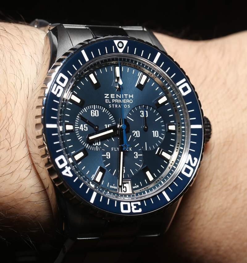 2013 年,真力時沿著藍色之路發布了已經廣受好評的 El Primero Stratos Flyback 腕表的藍色表盤版本。我們在 2011 年首次推出 Zenith Stratos 手表時首次亮相。2013 年出現了很多藍色手表,我個人對此沒有任何問題,因為漂亮的藍色運動手表看起來很棒。這不正是我們這里所擁有的嗎?藍色表盤上的藍色表圈搭配白色而不是一絲紅色,營造出輕盈的 Stratos 外觀,看起來為天空做好了準備。