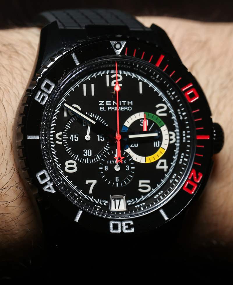 2010 年,真力時發布了帶有黑色和紋理銀色表盤的 El Primero Defy Rainbow。在我看來,這個版本的 Rainbow 是 Nataf 年代最好看的外觀之一。它比 Stratos 版本(寬度超過 45 毫米)更大,寬度為 46.5 毫米,并且是唯一一款在表盤上真正寫著“彩虹”字樣的 Rainbow。當時這些產品銷量不佳,生產時間也很短。如果你能找到一個——尤其是黑色表盤——我建議你把它撿起來。它非常有收藏家物品的制作材料。Defy Rainbow 沒有使用 405 機芯,而是使用了一種叫做 El Primero 400FC 的東西。我不知道有什么區別,因為它有所有相同的并發癥。更新:根據 Zenith 的說法,El Primero 400FC 有點獨特,因為它使用了“Zenithium”金屬擺輪橋板(整個 Defy 系列都這樣做),這是一種鋁、鈦和鈮合金。它的目的是吸收一些有助于準確性和壽命的沖擊。有趣的!它還恰好具有 300 米防水功能,并激發了計時秒針上真力時星形配重錘的誕生。您會注意到 Stratos Rainbow 使用與 2010 Defy Rainbow 完全相同的秒針。