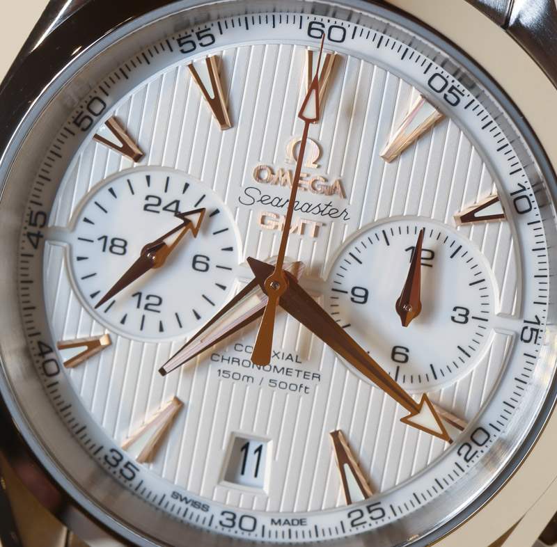 在設(shè)計(jì)方面,Omega Aqua Terra Chronograph GMT 幾乎符合您對 Omega 的期望。在幾個月后推出時,將提供幾個版本,包括金質(zhì)和鋼質(zhì)表鏈。在高端,有實(shí)心 18k 紅金型號,以及帶精鋼表殼和 18k 紅金表圈、表冠和按鈕的雙色調(diào)版本。不過,大多數(shù)人可能會選擇全拋光鋼型號。表殼防水深度達(dá) 150 米,當(dāng)然還有藍(lán)寶石水晶。表盤結(jié)構(gòu)是獨(dú)一無二的,因?yàn)闅W米茄在表盤上使用了一塊板,提供凹陷子表盤的外觀,同時增加了深度和質(zhì)感。表盤顏色有深灰色和灰白色兩種,整體而言,表盤非常清晰。