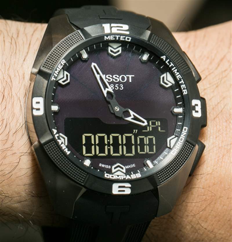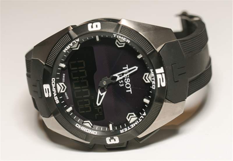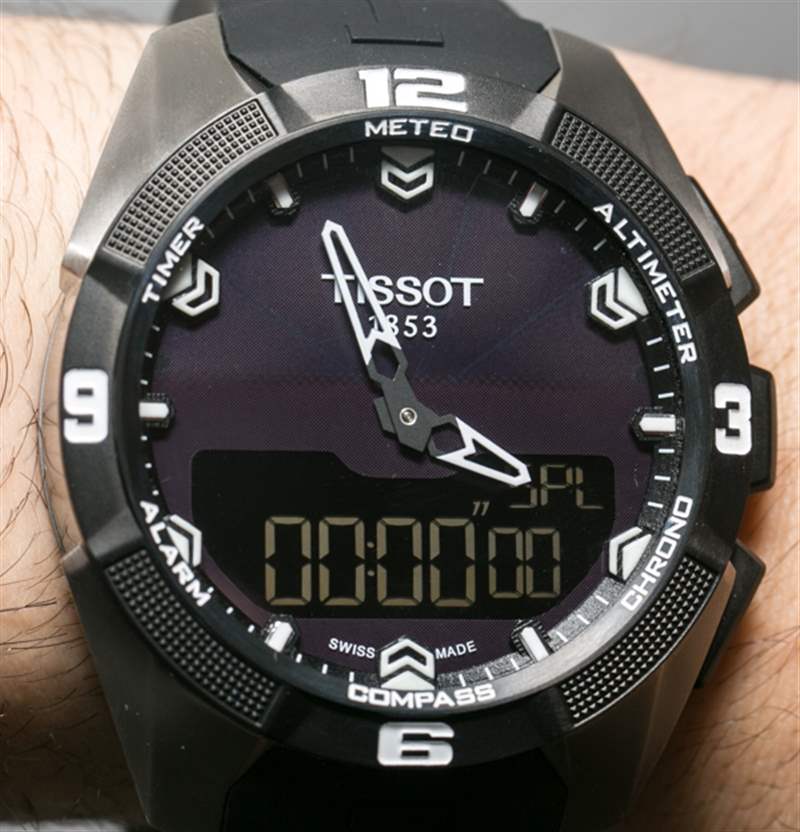 毫無疑問,您會(huì)注意到表盤的新 LCD 屏幕部分要大得多,并且與表盤齊平(相比之下,舊型號的屏幕要低一些)。負(fù)液晶顯示器也有更亮的指示器。平面設(shè)計(jì)看起來非常漂亮,有助于將顯示屏更多地放在臉部的主要部分。在功能上,天梭提到原始 T-Touch 的幾乎所有東西都在這里,以及后來型號的一些功能,例如帆船賽功能以及計(jì)時(shí)碼表的圈數(shù)計(jì)數(shù)器。當(dāng) T-Touch Expert Solar 在不久的將來最終發(fā)布時(shí),我們將能夠列出最終功能。