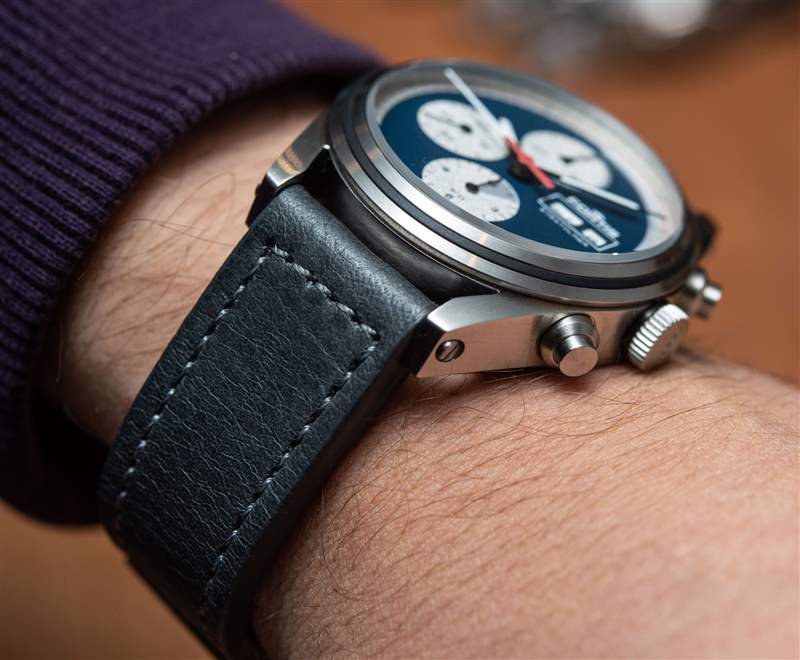 Stratoliner 有多種表盤組合可供選擇,就連貫性和獨特性的理想融合而言,極地白色和藍色表盤可能是其中最好的。Fortis 為其表盤的纖薄而感到自豪,而且小表盤是平坦的,而不是凹陷的;日期和星期顯示都比平常更清晰,更靠近水晶。指針大而易讀,具有強烈的夜光和黑色輪廓,注射器式分針以精致的刻度準確地指示分鐘。雖然繁忙的秒針刻度非常適合準確讀取計時秒針,但它使分鐘的讀取變得復雜。由于每隔五個位置沒有一個大的時標,因此以分鐘的精度報時需要一些時間來適應。