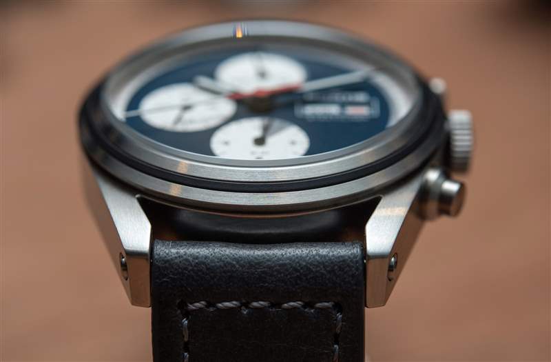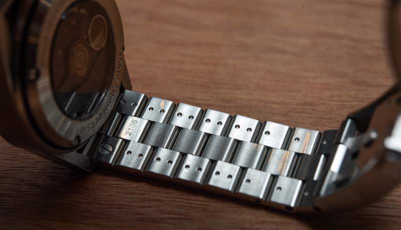 41 毫米寬的表殼采用再生不銹鋼制成,在金屬中觀看時最能欣賞到美感。塊狀表耳以強烈的曲線打造出平流層的輪廓,配有兩個倒置的按鈕和被橡膠條分成兩半的表圈。就像表盤一樣,表殼乍一看也很簡單——可以說太簡單了,但這種設(shè)計會通過長時間的佩戴展現(xiàn)出經(jīng)過深思熟慮的新細節(jié)。表殼和表鏈感覺可以使用很長時間——不僅僅是因為它們的塊狀設(shè)計,還因為它們的貼合度和表面處理。一個典型的例子是帶有三個墊圈的旋入式表冠,按鈕的精確配合保證了 200m(660ft)的防水性能,這適合在真正的手表愛好者的監(jiān)督下制造的手表。