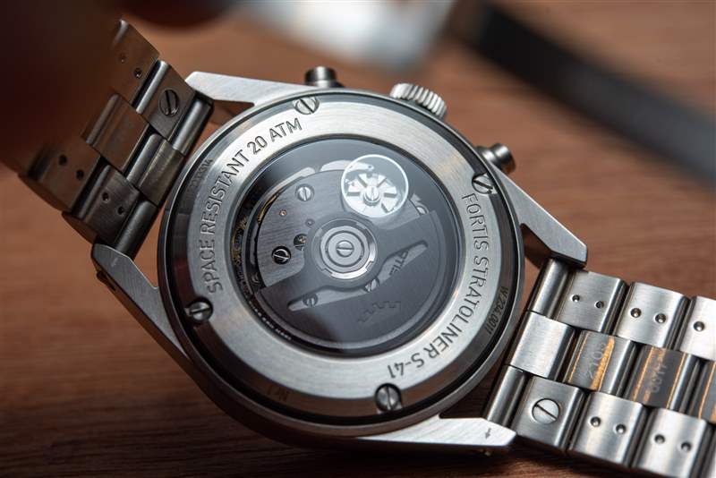 Fortis Stratoliner 由 Fortis Werk 17 提供動力 – 請注意,它不是 法語中的 “機芯” ,而是德語中的“werk ”,暗示了該品牌的 Grenchen 基地。如果您是 Fortis 的鐵桿粉絲,您會稱其為 Werk siebzehn(德語中的“17”)。Werk 17 是一款經(jīng)過“平流層測試”的自制機芯,與高端機芯制造商 La Joux-Perret 合作制造,而非計時碼表 Fortis Werk 13 則由勞力士-都鐸-香奈兒旗下的 Kenissi Manufacture 制造。Werk 17 結(jié)合了 60 小時的動力儲存、軸承式自動上鏈系統(tǒng)和導柱輪操作的計時碼表。