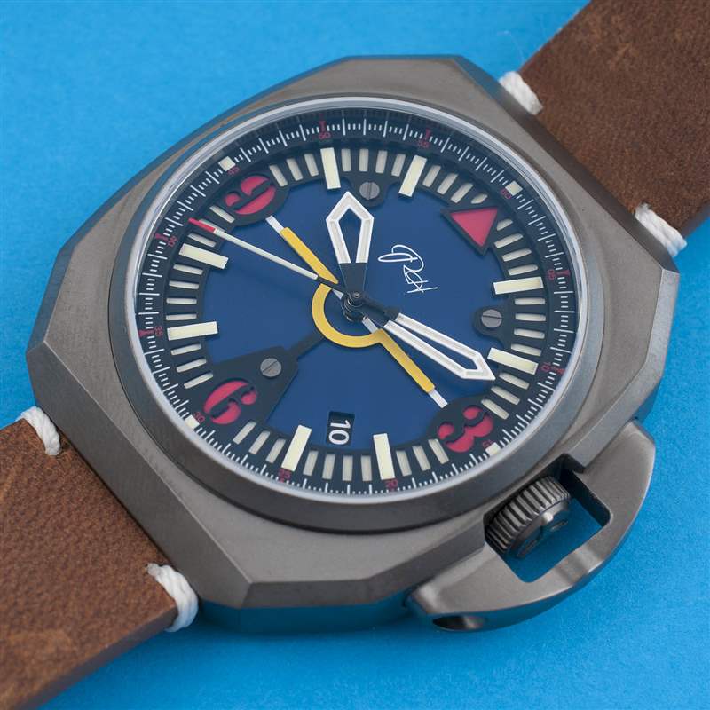 這款手表的名字來源于飛機上的姿態計(不要與高度混淆),指示飛機相對于地平線的方向。雖然靈感顯而易見,但它很微妙,不會打在你臉上,也不會讓人感覺像是在向 Bell & Ross 致敬。帶有藍色 AR 涂層的藍寶石水晶玻璃使表盤清晰可見。廣告留言廣告信息結束