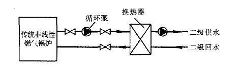 某住宅小區采用地板輻射供暖系統,供熱面積 1 . 5 × 10 m ,供暖室內設計溫度為 2O ℃ ,設計熱負荷為 825 kW 。原配置 1 臺 1.4 MW 的傳統燃氣鍋爐,設計熱效率為 88 % 。由于傳統燃氣鍋爐采用間歇運行,室內溫度變化幅度較大,且能耗較高,改造時擬選用 1 臺 1 MW 冷凝式燃氣鍋爐。