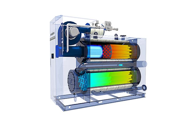方快容積式熱水鍋爐系列設(shè)計(jì)為燃燒器下置式煙火管容積式結(jié)構(gòu),燃料經(jīng)燃燒器霧化后在爐膽內(nèi)微正壓燃燒,高溫?zé)煔庠跔t膽內(nèi)進(jìn)行輻射換熱后進(jìn)入煙火管對流換熱后經(jīng)下煙室排出。通過采用計(jì)算機(jī)輔助設(shè)計(jì),優(yōu)化各個受熱面,爐體結(jié)構(gòu)設(shè)計(jì)更加合理。 鍋爐無需冷凝器,爐體內(nèi)部即可實(shí)現(xiàn)冷凝,排煙溫度可低至50℃以下,熱效率可達(dá)106.6%以上。