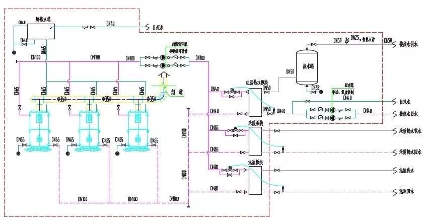 膨脹罐、軟水處理器組成。 圖1是峨眉山某溫泉酒店的熱水系統圖,鍋爐采用3臺方快CLHS0.35-95/70-YQ