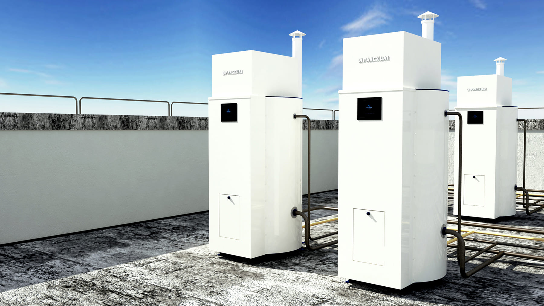 別墅熱水系統(tǒng)的室外型熱水爐(建議方快鍋爐阿波羅A系列)應(yīng)安裝在通風(fēng)良好及便于操作的室外場所 ( 如底層庭院或高層開放式工作陽臺(tái) ) ,嚴(yán)禁安裝在無標(biāo)準(zhǔn)護(hù)欄及無通往室內(nèi)小門的空調(diào)外機(jī)位置或封閉的陽臺(tái)內(nèi)以任何可能影響安全使用及正常操作的位置。熱水爐本身抗風(fēng)防雨;熱水爐附近需有地漏或明溝,以便于日后排污及安全閥泄壓排水之用;室內(nèi)型放置于陽臺(tái)上,陽臺(tái)必須封閉;熱水鍋爐接管側(cè)安裝空間:左、右側(cè)至少 40cm ;正面?zhèn)戎辽?nbsp;50cm ,背側(cè)至少 50cm ,鍋爐頂部預(yù)留空間不小于 1m ;嚴(yán)禁將室外型鍋爐安裝在室內(nèi),室內(nèi)的鍋爐(建議方快鍋爐威利銳V系列)必須有單獨(dú)煙道通向室外并保障煙管密封不漏氣。