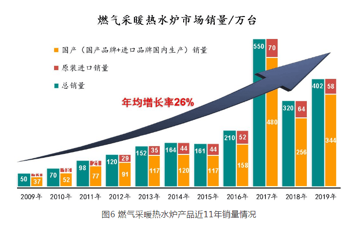 根據(jù)統(tǒng)計(jì)數(shù)據(jù),自 2009 年以來燃?xì)獠膳療崴疇t產(chǎn)品銷量急劇上升,中國(guó)國(guó)內(nèi)市場(chǎng) 2009 年銷量為 50 萬臺(tái)(原裝進(jìn)口 13 萬臺(tái)),截至 2019 年底,國(guó)內(nèi)市場(chǎng)銷量達(dá)到了 402 萬臺(tái)(原裝進(jìn)口 58 萬臺(tái)),年均增長(zhǎng)率達(dá) 26% ,遠(yuǎn)遠(yuǎn)超出中國(guó)經(jīng)濟(jì)發(fā)展的平均速度。