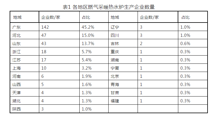 截止 2019 年 8 月底,有 314 家企業(yè)獲得了燃?xì)獠膳療崴疇t生產(chǎn)許可證。國(guó)內(nèi)各地區(qū)燃?xì)獠膳療崴疇t生產(chǎn)企業(yè)數(shù)量和分布情況見表 1 和圖 1 。
