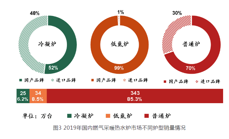 2019 年用于“煤改氣”工程的燃?xì)獠膳療崴疇t銷量為 230 萬臺(tái),占全年總銷量的 57% ,相比 2018 年(“煤改氣”工程用銷量 145 萬臺(tái))增幅 58.6% 。其中,冷凝爐銷量為 8 萬臺(tái),占“煤改氣”工程總銷量的 3.5% ;低氮爐銷量為 33 萬臺(tái),占“煤改氣”工程總銷量的 14.3% ;普通爐銷量為 189 萬臺(tái),占“煤改氣”工程總銷量的 82.2% 。國(guó)產(chǎn)品牌銷量為 219 萬臺(tái),占“煤改氣”工程總銷量的 95% ;進(jìn)口品牌銷量為 11 萬臺(tái),占“煤改氣”工程總銷量的 5% 。