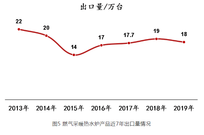 2019 年燃?xì)獠膳療崴疇t全年出口總量為 18 萬臺(tái),相比 2018 年( 19 萬臺(tái))減少 1 萬臺(tái),降幅 5.3% 。圖 5 為燃?xì)獠膳療崴疇t產(chǎn)品近 7 年出口量分布情況。
